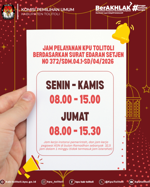 Komisi Pemilihan Umum (KPU) Kabupaten Tolitoli menetapkan jadwal jam pelayanan kepada masyarakat dan pemangku kepentingan berdasarkan Surat Edaran Sekretariat Jenderal KPU Republik Indonesia Nomor 372/SDM.04.1-SD/04/2026 tentang Jam Kerja dan Pelayanan Selama Periode Operasional. Dalam upaya meningkatkan pelayanan publik yang efektif, transparan, dan akuntabel, KPU Tolitoli menyampaikan ketentuan jam operasional sebagai berikut: Jam Pelayanan Senin – Kamis: 08.00 – 15.00 WITA Jumat: 08.00 – 15.30 WITA (termasuk waktu untuk ibadah Jumat sesuai ketentuan jam kerja nasional) Pelayanan yang Dilakukan Selama jam operasional tersebut, pelayanan yang diberikan mencakup: Pendaftaran dan konsultasi pemilih Pengambilan formulir dan dokumen administrasi Pelayanan informasi pemilu dan kewajiban pemilih Pemberian layanan aduan dan aspirasi publik Pelayanan teknis lainnya sesuai fungsi KPU Catatan Penting Pelayanan administrasi ditutup pada waktu istirahat singkat sesuai ketentuan internal KPU. Layanan darurat atau informasi penting tetap dapat diberikan di luar jam operasional melalui saluran kontak resmi KPU Tolitoli. KPU Tolitoli mengimbau kepada masyarakat dan para pemangku kepentingan untuk memanfaatkan jam pelayanan yang telah ditetapkan ini secara maksimal demi kelancaran proses administrasi dan partisipasi publik dalam penyelenggaraan pemilu. ....