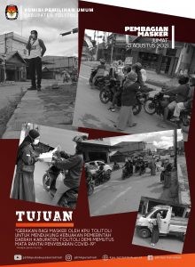 Berdasarkan fakta penyebaran Covid 19 di Kabupaten Tolitoli, KPU Tolitoli hadir mendukung kebijakan Pemerintah Pusat dan Daerah dalam bentuk gerakan berbagi masker bagi masyarakat Tolitoli terutama pengguna jalan roda dua dan roda 4, kegiatan gerakan bagi-bagi masker yang dilakukan oleh KPU Tolitoli di Pusatkan di Lampu Merah jln Abdul Muis lonti. Sasaran gerakan pembagian masker oleh KPU Tolitoli adalah masyarakat pengguna jalan yang tidak memakai masker pada saat berjalan kaki maupun berkendara. Kegiatan ini sekaligus memberikan edukasi pentingnya memakai masker untuk kesehatan bagi diri sendiri, bagi keluarga dan seluruh masyarakat. KPU Tolitoli juga menghimbau kepada masyarakat pengguna jalan untuk mematuhi protokol covid 19 dan mendukung kebijakan pemerintah baik pusat maupun Daerah terkait pemberlakuan PPKM Level 3 di Kabupaten Tolitoli untuk memutus mata rantai penyebaran covid 19 yang ada di Kabupaten Tolitoli.