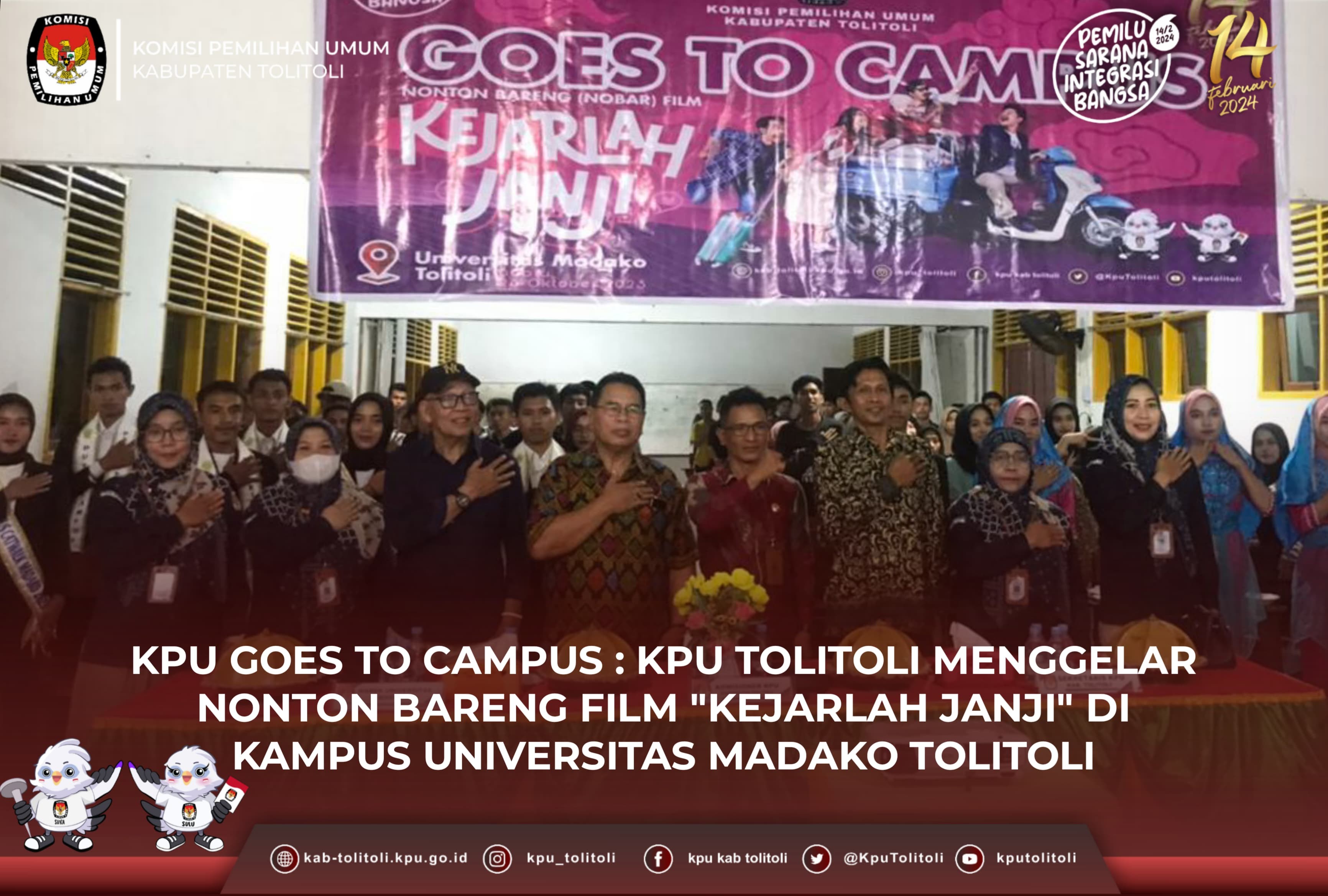 Tolitoli, kab-tolitoli.kpu.go.id – Komisi Pemilihan Umum Kabupaten Tolitoli melaksanakan KPU Goes To Campus dengan Tema Nonton Bareng (Nobar) Film “Kejarlah Janji” di Kampus Universitas Madako, Kecamatan Baolan, Kabupaten Tolitoli, Sabtu(28/10/2023).
