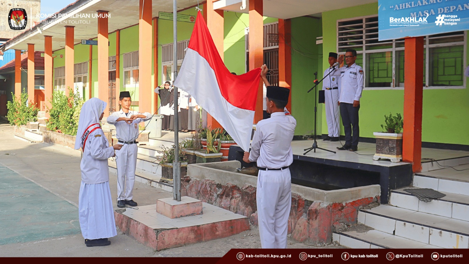 Upacara bendera berlangsung khidmat di halaman sekolah dan diikuti oleh seluruh siswa, guru, serta jajaran KPU Kabupaten Tolitoli. Usai pelaksanaan upacara, kegiatan dilanjutkan dengan sosialisasi pendidikan pemilih pemula yang disampaikan oleh perwakilan KPU Kabupaten Tolitoli. Dalam kesempatan tersebut, disampaikan materi mengenai pentingnya partisipasi pemilih dalam pemilu, tahapan pemilihan umum, serta peran strategis pemilih pemula dalam menentukan arah pembangunan bangsa.