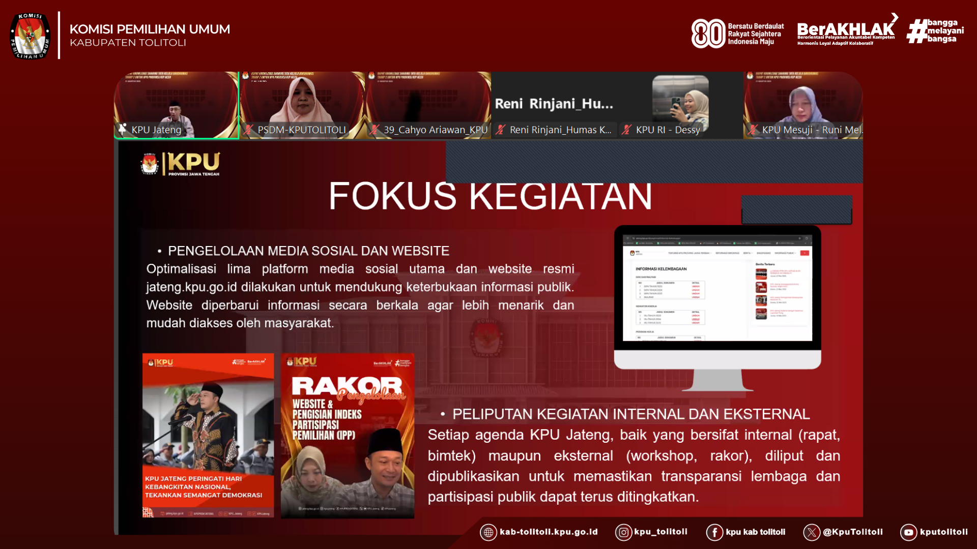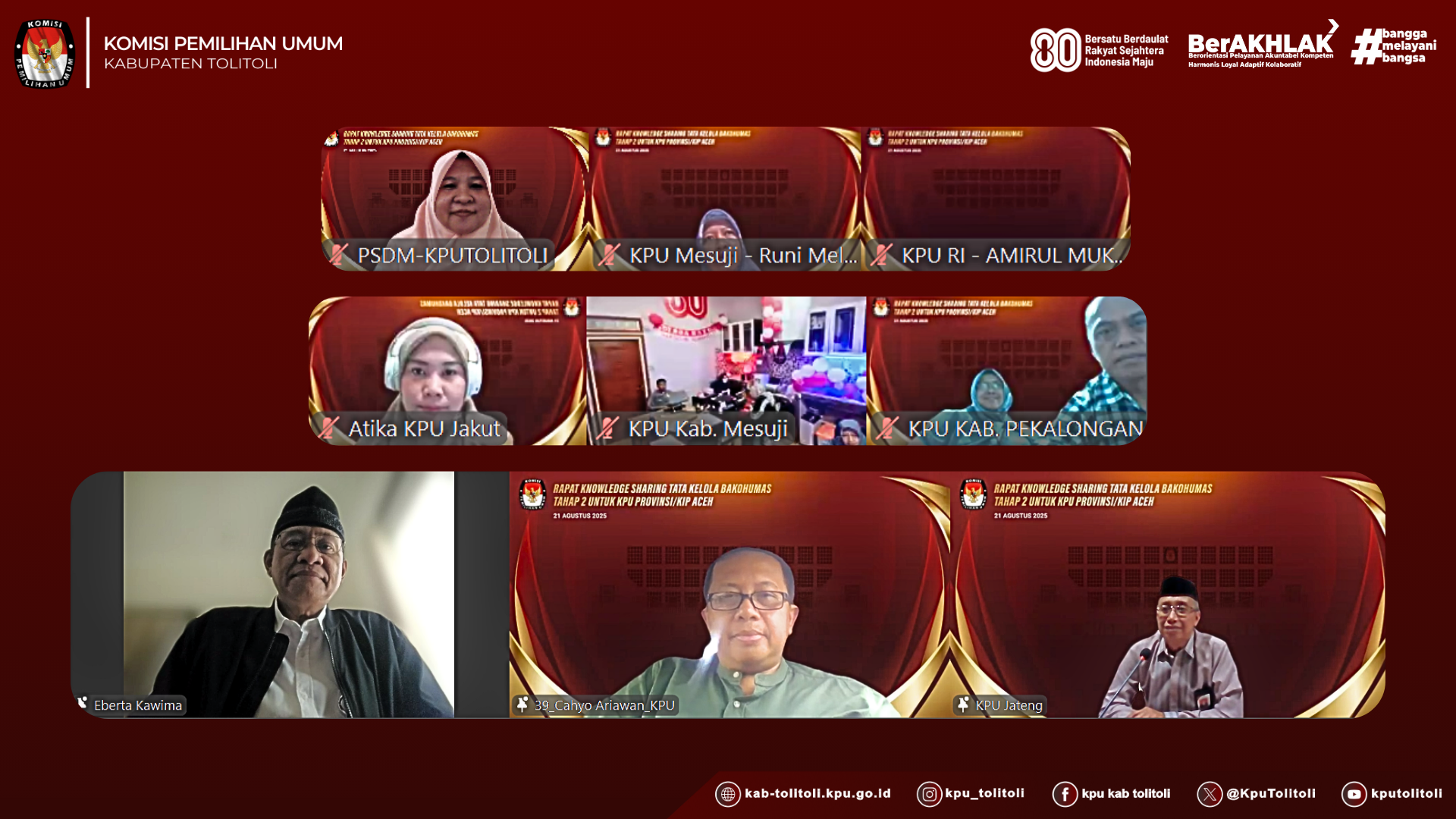 Tolitoli,kab-tolitoli@kpu.go.id,- KPU Kabupaten Tolitoli mengikuti kegiatan Rapat Knowledge Sharing Tata Kelola Bakohumas Tahap 2 yang diselenggarakan secara daring oleh KPU RI, Kamis (21/08/2025).