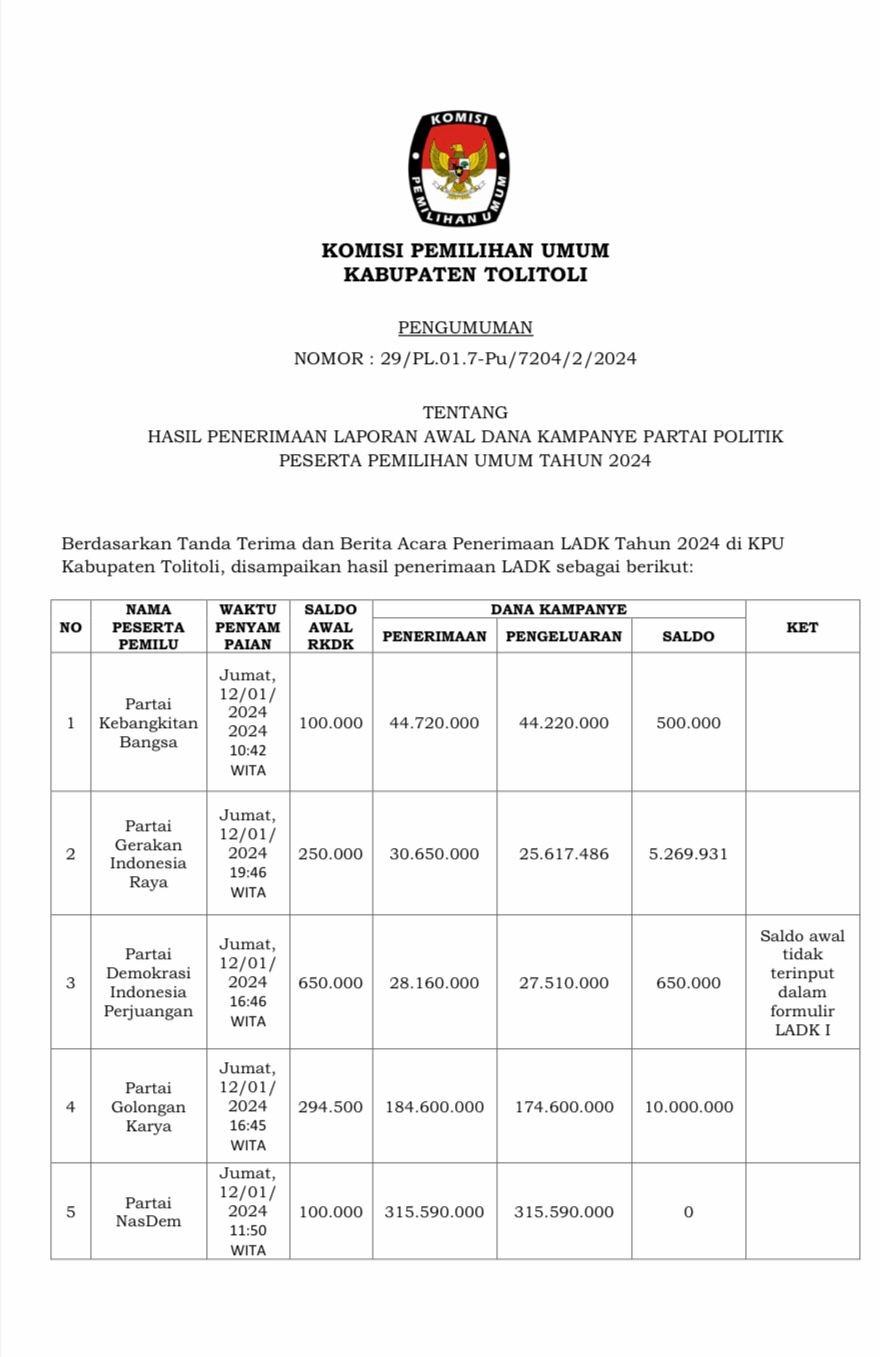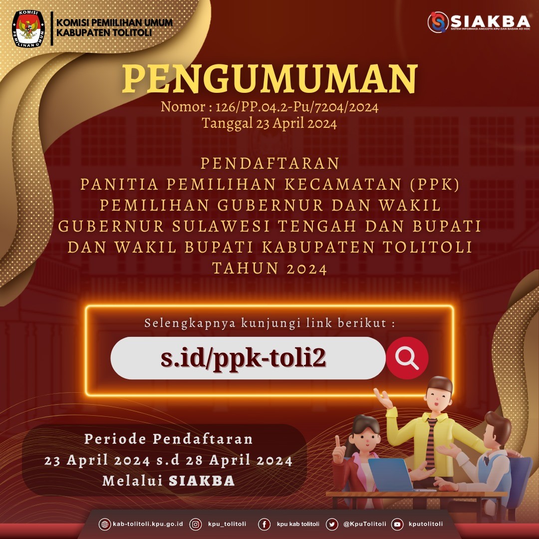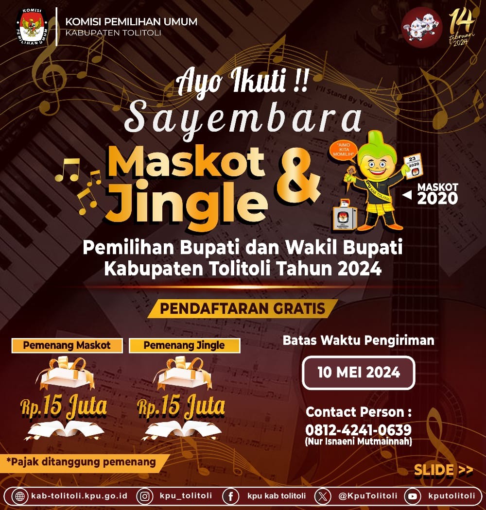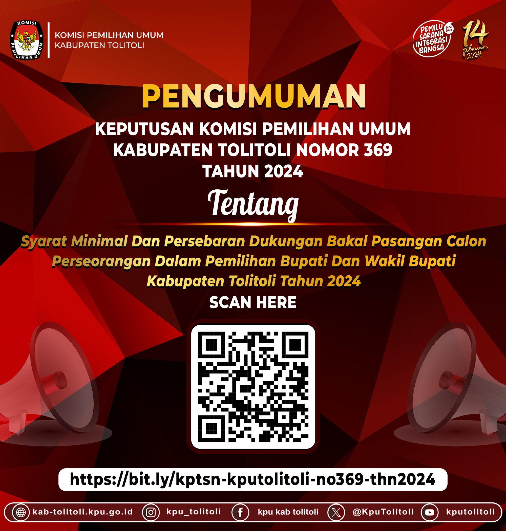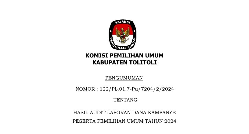 Dalam rangka melaksanakan ketentuan Pasal 42 Peraturan Komisi Pemilihan Umum Nomor 9 Tahun 2022 tentang Partisipasi Masyarakat dalam Pemilihan Umum dan Pemilihan Gubernur dan Wakil Gubernur, Bupati dan Wakil Bupati, dan/atau Walikota dan Wakil Walikota serta Peraturan Komisi Pemilihan Umum Nomor 2 Tahun 2024 tentang Tahapan dan Jadwal Pemilihan Gubernur dan Wakil Gubernur, Bupati dan Wakil Bupati, dan/atau Walikota dan Wakil Walikota Tahun 2024, Komisi Pemilihan Umum Kabupaten Tolitoli menerima pendaftaran bagi Pemantau dan Lembaga Survei yang ingin berpartisipasi dalam tahapan pemilihan Bupati dan Wakil Bupati Tahun 2024, dengan ketentuan sebagai berikut : download di sini