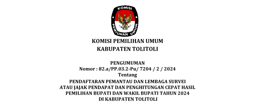 TENTANG PENDAFTARAN PEMANTAU DAN LEMBAGA SURVEI ATAU JAJAK PENDAPAT DAN PENGHITUNGAN CEPAT HASIL PEMILIHAN BUPATI DAN WAKIL BUPATI TAHUN 2024 DI KABUPATEN TOLITOLI
