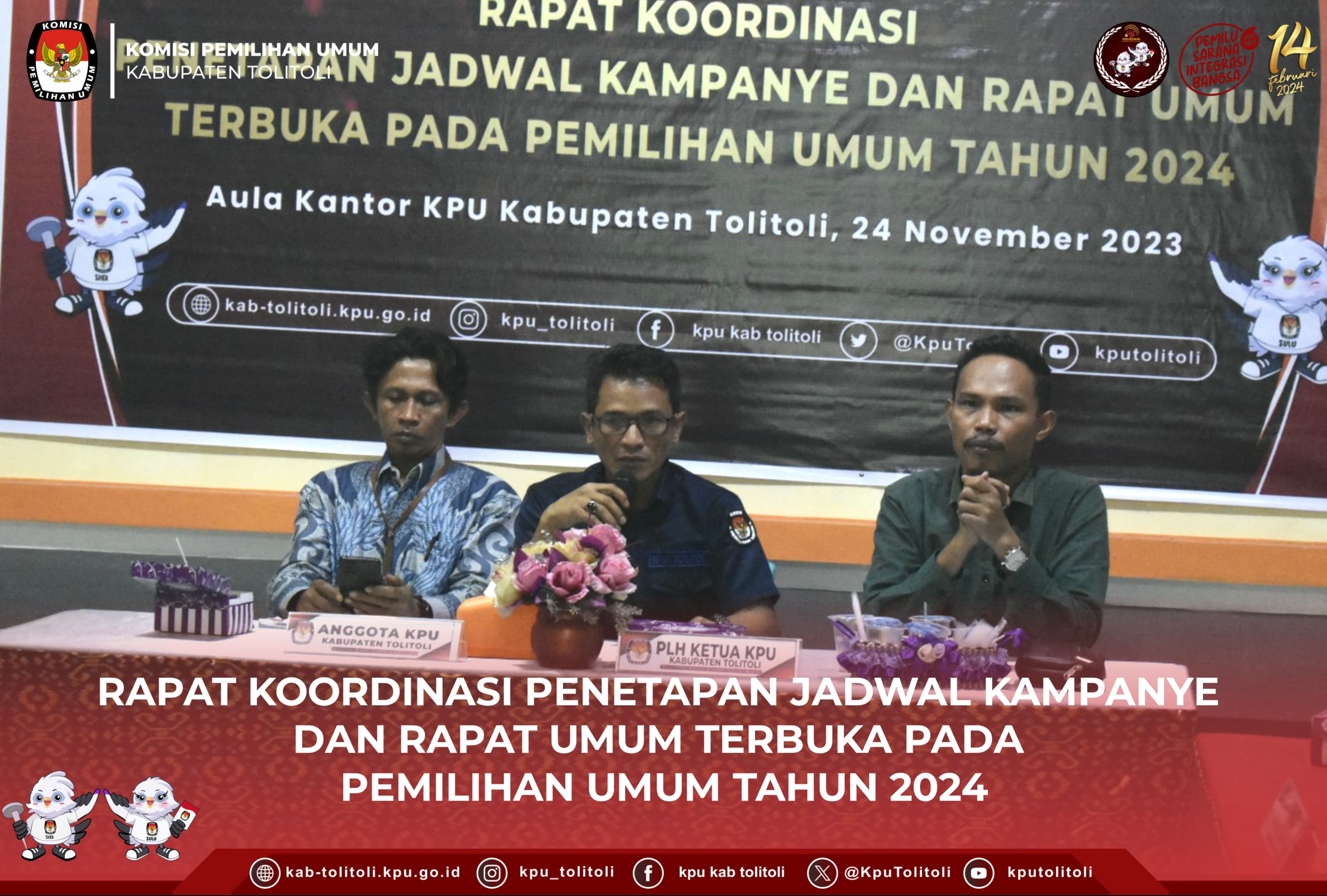 Tolitoli, kab-tolitoli.kpu.go.id – Komisi Pemilihan Umum Kabupaten Tolitoli melaksanakan Rapat Koordinasi (Rakor) Penetapan Jadwal Kampanye dan Rapat Umum Terbuka Pada Pemilihan Umum Tahun 2024 di Aula Kantor KPU Kabupaten Tolitoli, Jum’at(24/11/2023). Anggota KPU Divisi Perencanaan, Data dan Informasi, Nasrin selaku Plh. Ketua mengatakan kegiatan ini dilaksanakan guna berabagi informasi terkait kampanye, dana kampanye dan partisipasi masyarakat secara teknis. Nasrin mengatakan ini sangat penting untuk menyukseskan Pemilu Tahun 2024 nantinya. Kegiatan dilanjutkan dengan pemaparan materi dari Anggota KPU Kabupaten Tolitoli Divisi Sosialisasi Pendidikan Pemilih, Partisipasi Masyarakat dan Sumber Daya Manusia, Warman Maulana. Ia menjelaskan informasi seputar kampanye pemilu Tahun 2024. Warman mengatakan bahwa kampanye Pemilu penting dipahami oleh peserta Pemilu. Selain itu ia juga meminta masukan dan tanggapan dari peserta rakor terkait jadwal kampanye. Turut hadir pada kegiatan tersebut, Anggota KPU Divisi Teknis Penyelenggraan Pemilu, Kepala Sub Bagian Teknis dan Partisipasi Masyarakat, Bdan Pengawas Pemilu (Bawaslu) serta Petugas Penghubung/LO Partai Politik Peserta Pemilu.(Humas KPU Kabupaten Tolitoli Mutmainnah/foto Nurfausi/ed Herdyanti).