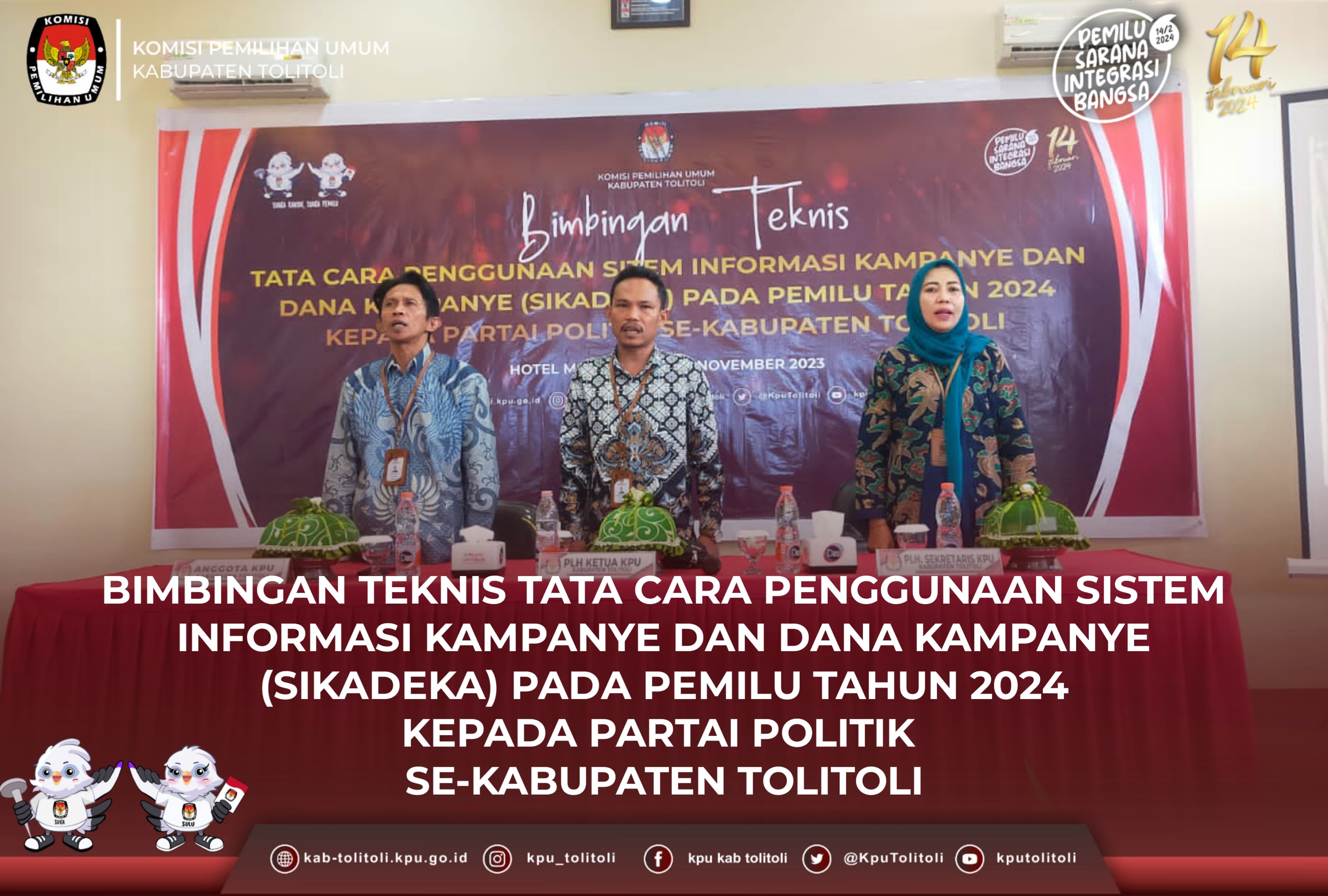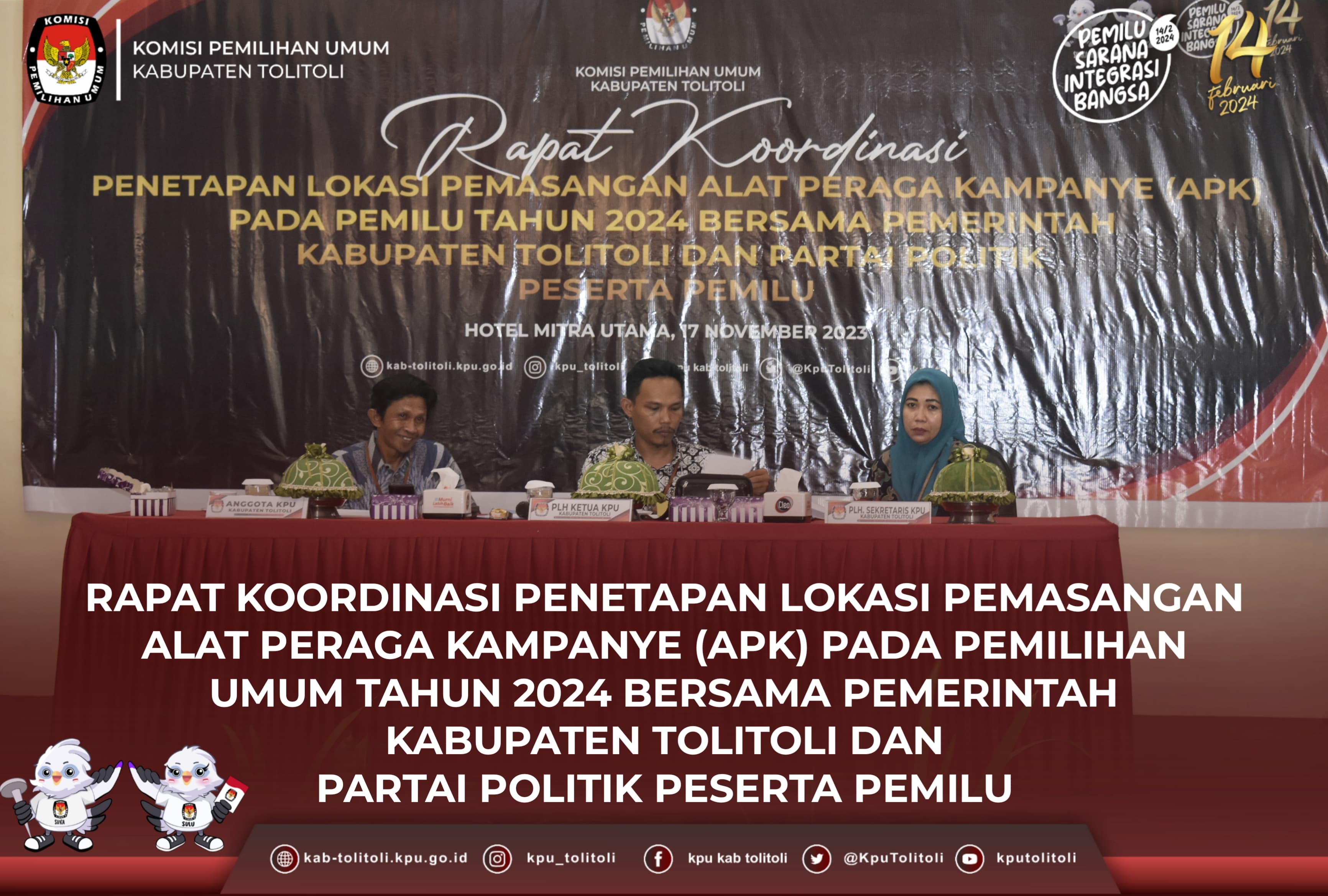 Tolitoli, kab-tolitoli.kpu.go.id – Komisi Pemilihan Umum Kabupaten Tolitoli melaksanakan Rapat Koordinasi penetapan lokasi pemasangan Alat Peraga Kampanye (APK) pada Pemilihan Umum Tahun 2024 bersama pemerintah Kabupaten Tolitoli dan Partai Politik peserta Pemilu di aula Hotel Mitra Utama, Jum'at, (17/11/2023).