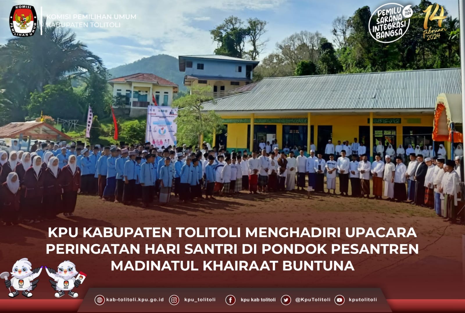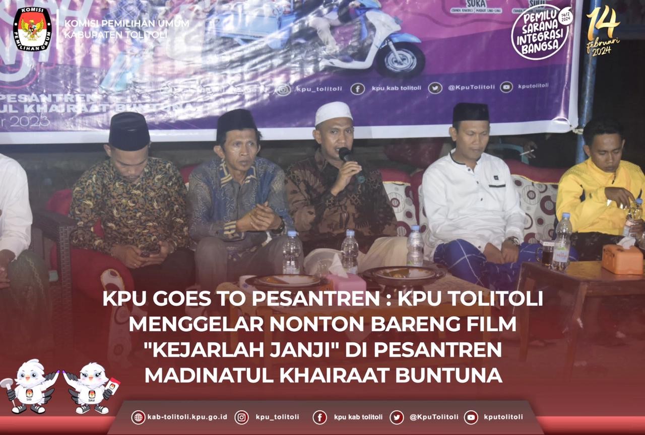 Tolitoli, kab-tolitoli.kpu.go.id – Komisi Pemilihan Umum Kabupaten Tolitoli melaksanakan KPU Goes To Pesantren dengan Tema Nonton Bareng (Nobar) Film “Kejarlah Janji” di Pondok Pesantren Madinatul Khairaat Desa Buntuna, Kecamatan Baolan Tolitoli, Minggu(22/10/2023). Kegiatan ini bertepatan dengan Hari Santri Nasional yang jatuh pada tanggal 22 Oktober 2023. Dalam sambutannya Ketua KPU Kabupaten Tolitoli Junaidi menyampaikan, kegiatan ini dilaksanakan dalam rangka peningkatan partisipasi masyarakat dan mendukung tahapan Pemilu di Tahun 2024 nantinya. Kegiatan nonton bareng di Pesantren ini, katanya merupakan strategi sosialisasi pendidikan pemilih khususnya kepada pemilih pemula agar pesan-pesan kepemiluan bisa disampaikan dengan lebih ringan dan efektif. Ia juga memberikan apresiasi yang sebesar-besarnya kepada Koordinator Divisi Sosialisasi Pendidikan Pemilih, Partisipasi Masayarakat dan SDM beserta Tim atas sukses nya kegiatan ini. Sementara itu, Pimpinan Pondok Pesantren mengingatkan kepada para santri sebagai Pemilih Pemula untuk menggunakan hak pilihnya pada Pemilu nanti. Ucapan terimakasih yang sebesar-besarnya di ucapkan Junaidi untuk pihak Pondok Pesantren Madinatul Khairaat yang telah membantu mensukseskan jalannya kegiatan ini. Kegiatan nobar diikuti oleh 100 santri dan santriwati Ponpes Madinatul Khairaat bersama dengan seluruh Komisioner dan Sekretariat KPU Kabupaten Tolitoli. (Humas KPU Kabupaten Tolitoli Mutmainnah/Foto Winda/Ed Herdyanti)