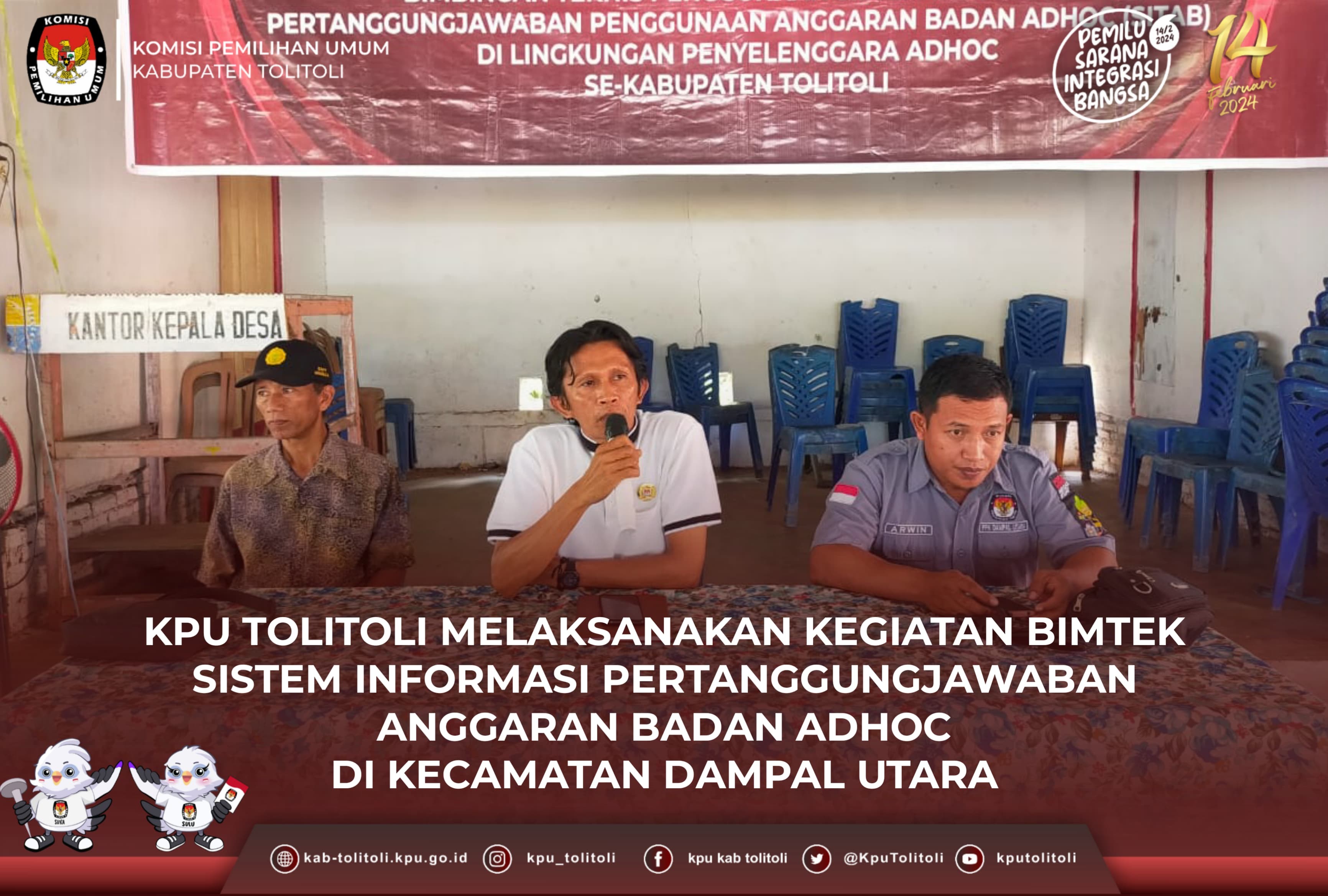 Tolitoli_Dalam rangka menyamakan pemahaman dalam penggunaan sistem informasi pertanggungjawaban anggaran badan adhoc (SITAB), KPU Kabupaten Tolitoli menggelar Bimbingan Teknis penggunaan SITAB yang diikuti oleh Ketua, Bendahara dan Sekretrais PPK dan PPS di Kecamatan Dampal Utara pada hari Rabu, 04 Oktober 2023.