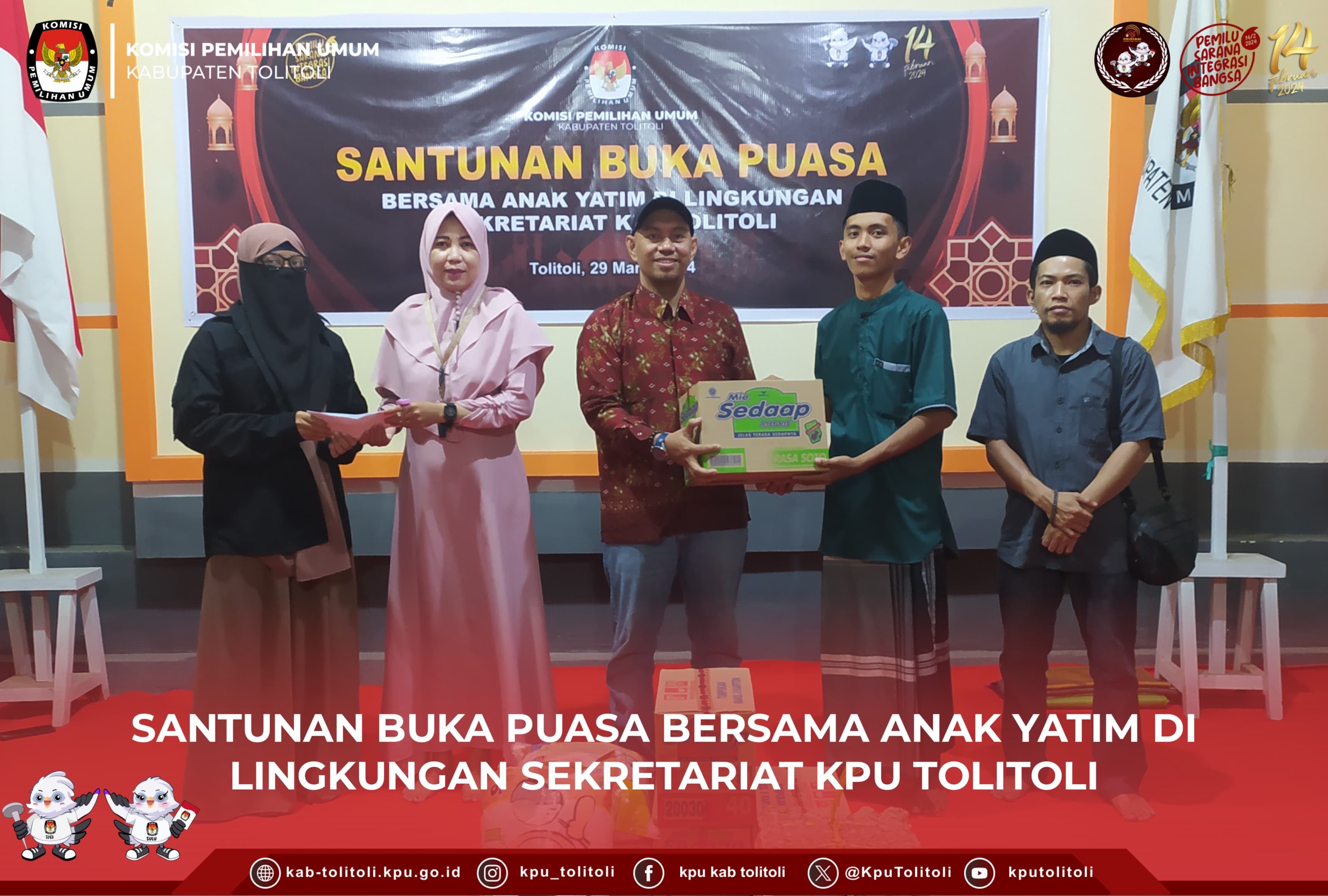 Tolitoli, kab-tolitoli.kpu.go.id – Komisi Pemilihan Umum Kabupaten Tolitoli melaksanakan Santunan dan Buka Puasa Bersama Anak Yatim Dilingkungan Sekretariat Kabupaten Tolitoli, dilaksanakan di Aula Kantor KPU Kabupaten Tolitoli pada Hari Jum’at, 29 Maret 2024. Plh Ketua KPU Kabupaten Tolitoli memberikan sambutan. Marsyuki mengatakan, kegiatan ini dilaksanakan sebagai bentuk kepedulian terhadap generasi bangsa sekaligus mempererat tali silaturahmi antar sesama. Ia juga mengatakan kegiatan ini bertujuan untuk mengucap syukur atas kelancaran pelaksanaan Pemilihan Umum Tahun 2024 di Kabupaten Tolitoli. Ditempat yang sama Plh. Selkretaris Ovelio Layuk mengucapkan terimakasih kepada Pihak Yayasan Panti Asuhan At-Tanwir. Kegiatan dilanjutkan dengan buka puasa bersama dan sholat Maghrib secara berjama’ah. Turut hadir, Anggota KPU Divisi Sosialisasi Pendidikan Pemilih, Partisipasi Masyarakat dan Sumber Daya Manusia, Kepala Sub Bagian Teknis Penyelenggaraan Pemilu dan Partisipasi dan Hubungan Masyarakat serta jajaran Staf KPU Kabupaten Tolitoli.(Humas KPU Kabupaten Tolitoli Mutmainnah/foto Nurfausi/ed Herdyanti)