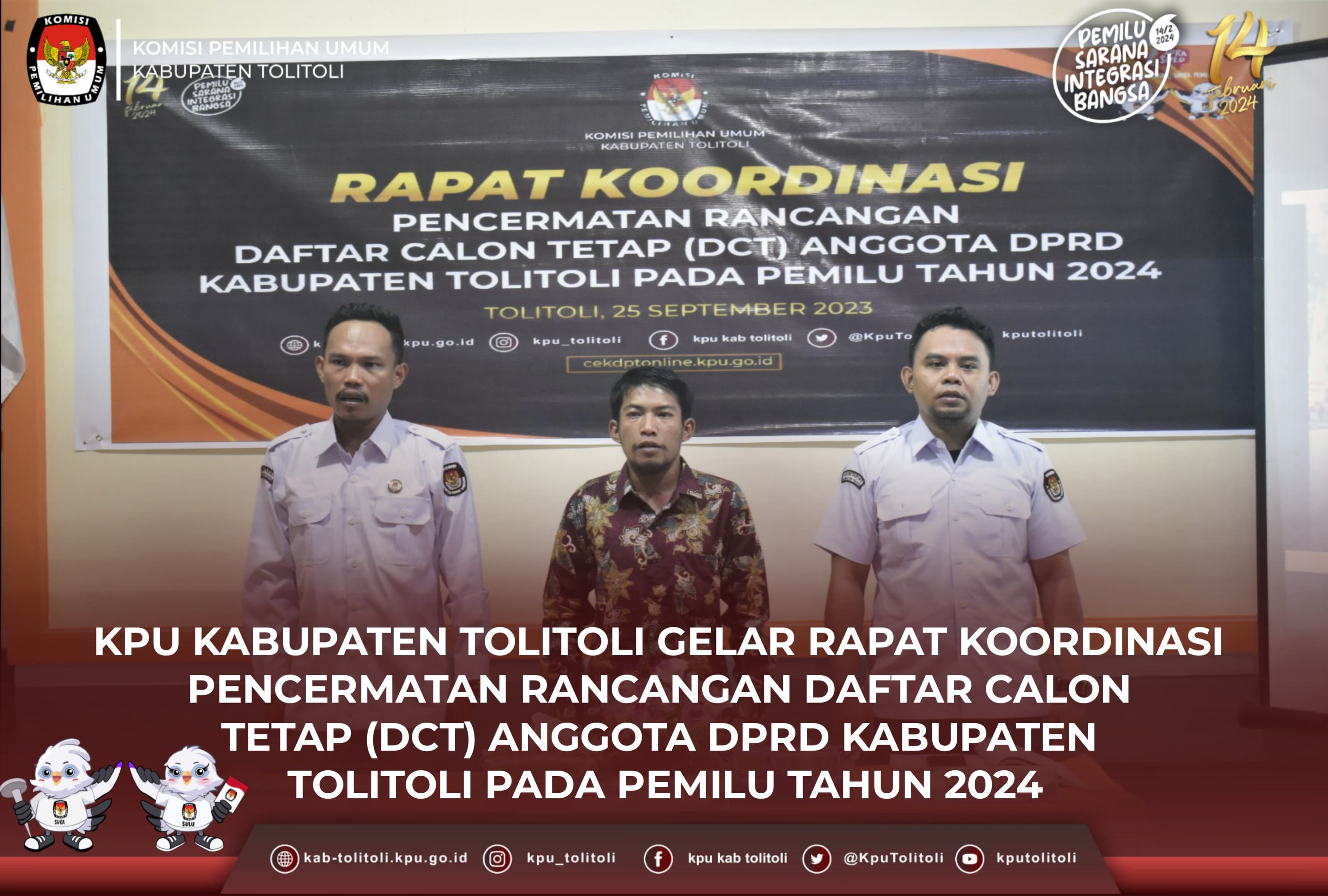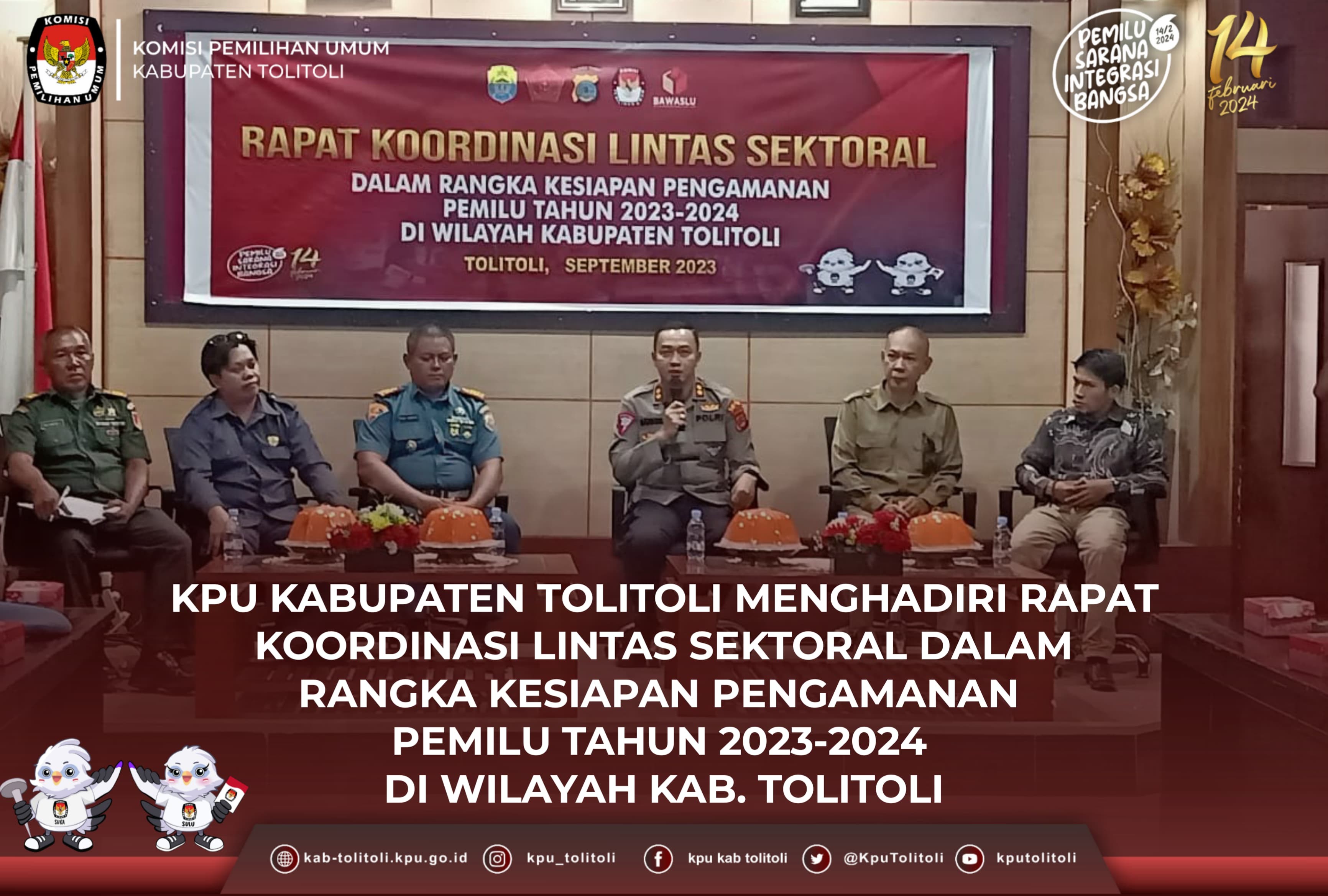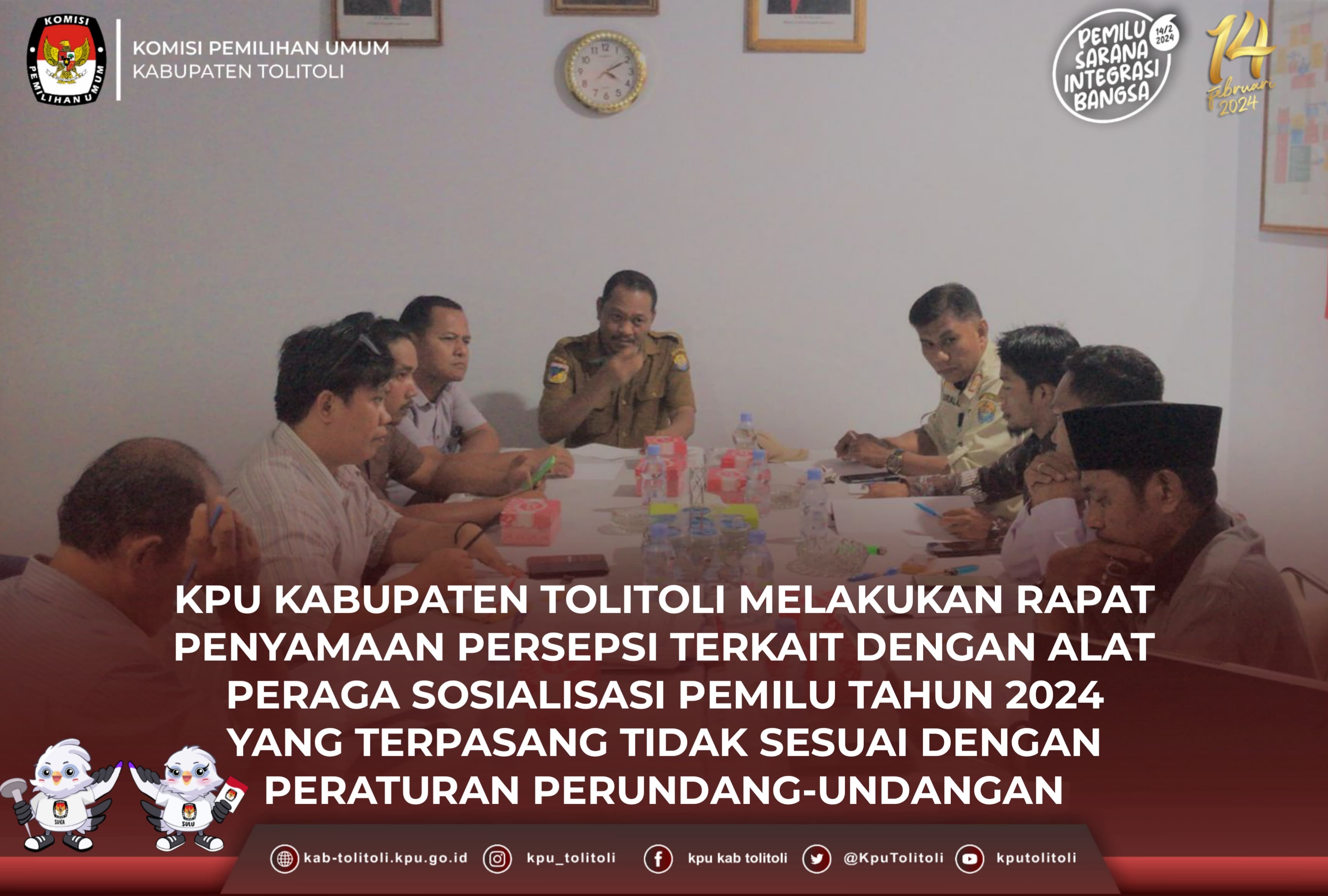 Dalam kesempatan itu turut hadir Pimpinan Bawaslu, Komisioner KPU, Kasat Pol-PP, Perwakilan dari Polres Tolitoli, Sekretaris Dinas Lingkungan Hidup, serta perwakilan dari Dinas Perumahan dan Kawasan Permukiman (Disperkim) Kabupaten Tolitoli bertempat di Aula Badan Pengawas Pemilu (Bawaslu) Kabupaten Tolitoli, Selasa, 26 September 2023. Kegiatan itu dibuka oleh Fadjar Syadik Selaku Ketua Bawaslu Kabupaten Tolitoli. Dalam Rapat Itu dia menyampaikan bahwa kegiatan itu merupakan rapat tahapan awal dalam penyamaan persepsi terkait dengan alat peraga sosialisasi pemilu tahun 2024 yang terpasang tidak sesuai dengan peraturan perundang-undangan. Disela diskusi rapat tersebut, Rian Virvian Hidayat R. Pelelalu selaku Ketua Divisi Tekinis Penyelenggaraan Pemilu KPU Kabupaten Tolitoli menyampaikan bahwa perlu adanya himbauan kepada setiap Bacaleg yang memasang alat peraganya yang tidak sesuai dengan regulasi yang kemudian perlu juga ditertibkan. Kasat Pol-PP menyampaikan akan siap dalam penertiban alat peraga kampanye, sepanjang melanggar regulasi yang ada. Diakhir rapat tersebut Ketua Bawaslu menyampaikan bahwa pihak bawaslu akan terus berkoordinasi dengan segala pihak-pihak terkait untuk melakukan tindakan pencegahan alat peraga yang tidak sesuai dengan regulasi yang ada. Penulis : Humas KPU Kabupaten Tolitoli