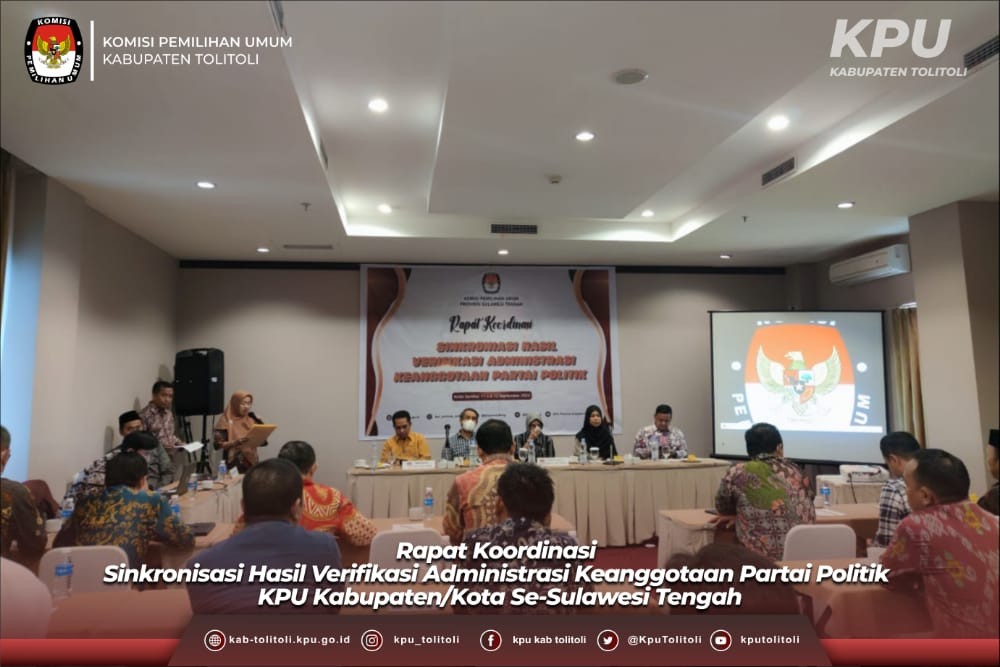 Tolitoli, kab-tolitoli.kpu.go.id- Senin 13 September 2022. Divisi Teknis Komisi Pemilihan Umum (KPU) Kabupaten Tolitoli, mengikuti Rapat Koordinasi Sinkronisasi Hasil Verifikasi Administrasi Keanggotaan Partai Politik, yang diselenggarakan oleh KPU Provinsi Sulawesi Tengah (Sulteng). Bertempat di Hotel Santika Palu pukul 09.00 wita sampai dengan selesai, kegiatan tersebut diikuti oleh sejumlah tamu undangan dari Divisi Teknis KPU Kabupaten/Kota se-Sulawesi Tengah, diantaranya adalah Anggota KPU Divisi Teknis Penyelenggaraan Pemilu, Kepala Sub Bagian (Kasubbag) Teknis, dan Operator Sistem Informasi Partai Politik (SIPOL). Rapat koordinasi tersebut kemudian dibuka oleh Dr. Nisbah, M.si selaku Ketua KPU Provinsi Sulawesi Tengah. Dalam sambutannya, Nisbah menyampaikan bahwa “proses verifikasi administrasi ini merupakan sebuah prinsip meneguhkan hak-hak konstitusi warga negara, dalam hal ini tentunya adalah anggota partai politik calon peserta pemilu 2024, yang telah memasukkan data keanggotaanya kedalam aplikasi SIPOL. Sebagai penyelenggara, KPU juga dituntut untuk bekerja ekstra, baik waktu, tenaga maupun pemikiran, untuk mengawal proses verifikasi administrasi ini melalui SIPOL hingga berakhirnya waktu verifikasi administrasi sesuai dengan jadwal yang telah ditentukan. Setelah melakukan verifikasi administrasi, selanjutnya KPU akan melakukan tahapan kegiatan verifikasi faktual terhadap partai politik yang telah dijadwalkan, tuturnya”. Kegiatan kemudian dilanjutkan dengan, pemberian materi dan sejumlah arahan kepada peserta rakor, tentang proses pelaksanaan verifikasi administrasi keanggotaan partai politik calon peserta pemilu tahun 2024 oleh Anggota KPU Provinsi Sulawesi Tengah yaitu Samsul Y. Gafur, SH (Divisi Teknis Penyelenggara Pemilu), Naharuddin, SH, MH (Divisi Hukum), Dr. Sahran Raden, S.Ag, SH., MH (Divisi Sosialisasi Pendidikan Pemilih, Partisipasi Masyarakat dan Sumber Daya Manusia) dan Halima, S.Ag (Divisi Perencanaan, Data, dan Informasi). Setelah menerima materi dan sejumlah arahan, rapat koordinasi dilanjutkan dengan sesi diskusi kepada para peserta kegiatan. Mengenai apa saja kendala dan permasalahan yang terjadi pada saat pelaksanaan verifikasi administrasi, beserta penanganan dalam pengambilan keputusan. Pada sesi ini, KPU Kabupaten/Kota mempunyai kendala yang hampir sama disetiap kabupaten. Salah satunya ialah klarifikasi keanggotaan ganda pada 2 (dua) partai politik. Pada petunjuk teknis (juknis) Nomor 260 tahun 2022, dikatakan bahwa klarifikasi keanggotaan ganda dilakukan secara langsung dengan memanggil anggota partai politik untuk melakukan klarifikasi keanggotaan yang disaksikan oleh Bawaslu dan Liaison Officer (LO) partai politik . Hal ini tentunya menjadi kendala, ketika yang bersangkutan mempunyai tempat tinggal yang jauh, sehingga tidak mungkinkan untuk bisa didatangkan dalam rentan waktu masa klarifikasi atau yang bersangkutan dalam keadaan sakit. Sehingga baik KPU Provinsi maupun KPU Kabupaten /Kota se-Sulteng mengambil tindakan untuk melakukan klarifikasi dengan metode Video Call (VCall) sebelum keluarnya Keputusan KPU Nomor 346 Tahun 2022 Tentang Perubahan Ketiga atas Keputusan KPU Nomor 260 Tentang Pedoman Teknis Bagi Komisi Pemilihan Umum, Komisi Pemilihan Umum Provinsi, Dan Komisi Pemilihan Umum Kabupaten/Kota Dalam Pelaksanaan Pendaftaran, Verifikasi, Dan Penetapan Partai Politik Peserta Pemilihan Umum Anggota Dewan Perwakilan Rakyat Dan Dewan Perwakilan Daerah. Rapat koordinasi kemudian ditutup oleh Nisbah selaku Ketua KPU Provinsi Sulteng, yang menerangkan bahwa pada kegiatan sinkronisasi kali ini, untuk melihat adanya kesamaan presepsi dalam pengambilan sikap terkait tanggung jawab kita untuk melaksanakan proses ke tahap selanjutnya. Nisbah juga berharap, kegiatan hari ini semakin memperkuat hubungan kita, soliditas kita, dalam rangka mengawal seluruh tahapan pemilu yang akan dilaksanakan. Nisbah berpesan “agar keteguhan prinsip, imparsialitas dan integritas kita tetap dikedepankan dalam proses kegiatan yang kita laksanakan pada verifikasi yang dilakukan terhadap partai politik calon peserta pemilu tahun 2024” tutupnya. (Humas KPU Tolitoli Afrizal)